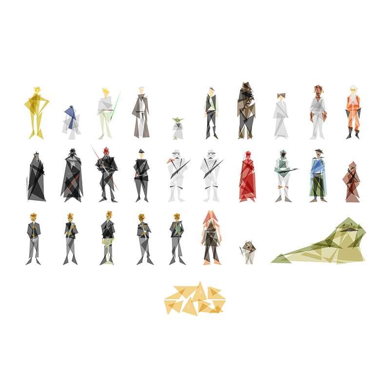 As most of the 90s kids I remember waking up every Saturday really early to watch all the cool shows like Teenage Mutant Ninja Turtles, Power Rangers, Pokemons and so on. And obviously at the evening there were always The Simpsons and Friends. Don't take me wrong, but even though I like Big Bang theory as any other man, it will never achieve the status of a legendary show as these 90s Tv shows. So these are deeply stuck in my heart and because of that I feel a bit nerd-ish. And so when I saw on 9gag this post where the author made characters from these Tv shows as minimalistic Lego figures it got me inspired to do something similar. I focused on the minimalism that has been captured in those Lego figures and applied it to things I like (apart from Lego. I love Lego too, but I wasn't gonna do the same thing as this guy did...), low-poly graphic. I've used semi-transparent triangles to capture the most important features of each character in a way that it makes it recognizable with the lowest amount of triangles (details) used. I think I've managed that for all the characters. Maybe except for the Emperor from Star Wars...